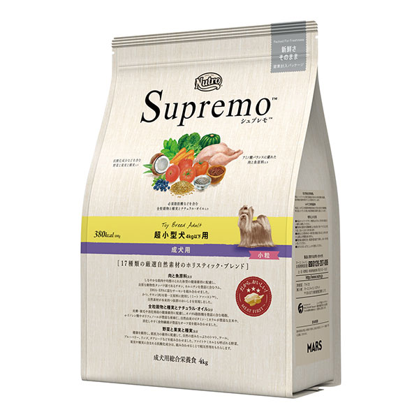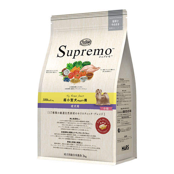 シュプレモ™ 超小型犬 成犬用は健康で元気な体、美しい皮膚・被毛の健康維持に配慮し、栄養素を豊富に含む高品質な自然素材を厳選し、最適な栄養バランスでブレンドしています。まだ顎・口が小さい、代謝エネルギーが高い、好き嫌いが多くなりがち、などの超小型犬の特徴に配慮しています。【超小型犬に適した小粒タイプ】