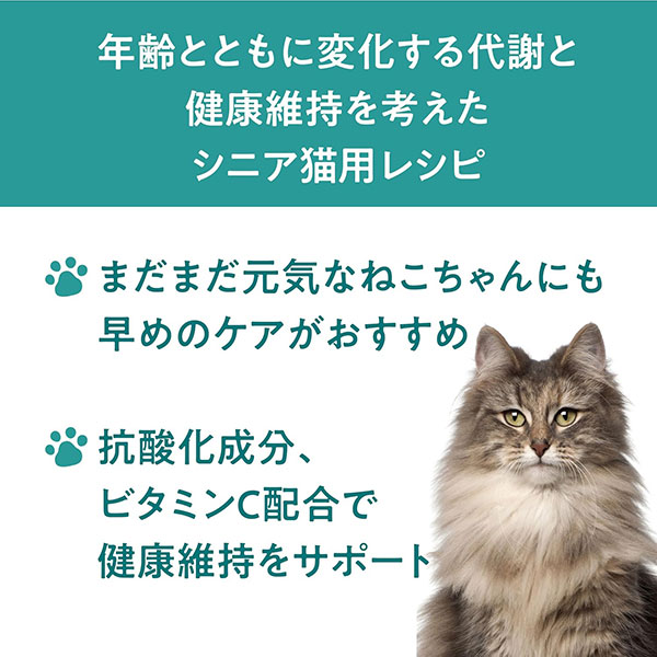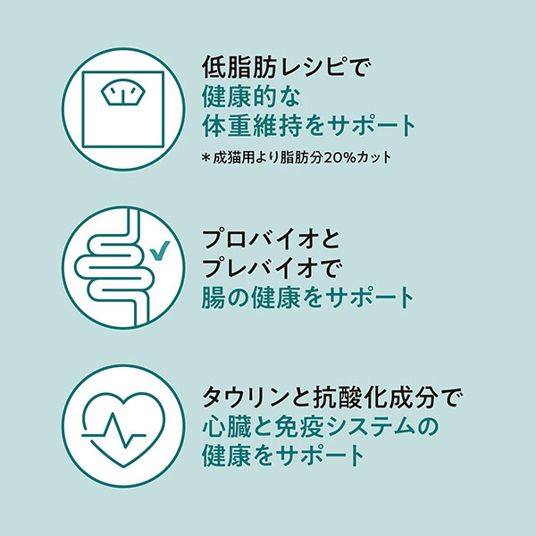 猫ねこちゃんが年を重ねるにつれて、消化の機能はますます重要になります。そのため、腸内環境の健康をサポートするプレバイオティクスとプロバイオティクスを含んでおり、消化を促進サポート、健康な便を維持します。栄養豊富なジャガイモ、リンゴ、ブルーベリーなどの成分は、皮膚の健康をss維持し、健康的で柔らかく光沢のある被毛をサポートします。抗酸化物質とタウリンも含まれており、健康を維持することで心臓と免疫の働きを保ち、シニア猫が活動的で快適な生活を送るのを助けます。