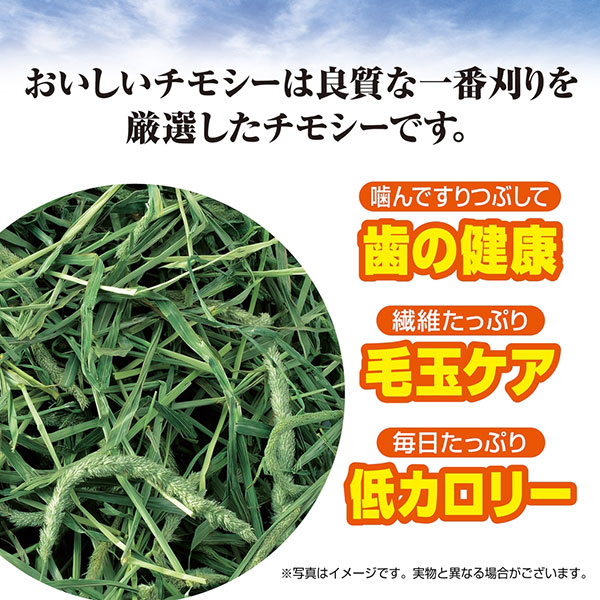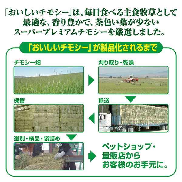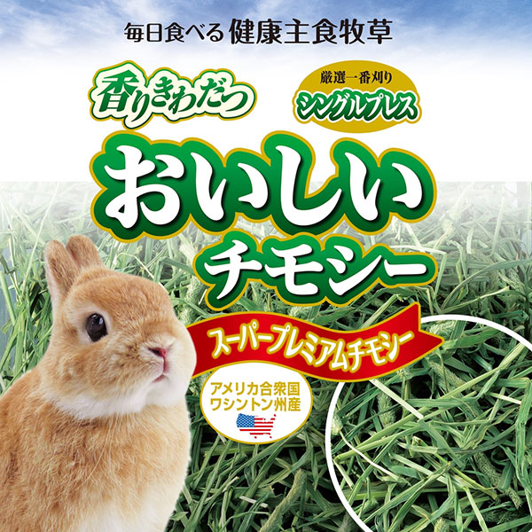 ●香りにこだわり、茶色い葉が少なく競走馬にも使用される最高級グレードの一番刈りチモシーを厳選して国内で袋詰めしています。●高圧縮のダブルプレスよりも圧縮・カットしていないシングルプレスを採用。●アメリカワシントン州の広大な気候で育てられた高級チモシーの中でも厳しい基準をもとに選別されたものだけを使用しています。●丈の長い牧草をすり潰しながら噛むことで、歯の伸びすぎを抑え、歯の健康維持をサポートします。●チモシーに豊富に含まれる繊維質は、飲み込んだ毛を絡めながら排出し、お腹の健康維持をサポートします。●主食として毎日食べる牧草は、高繊維でカロリーが低いチモシーが最適です。
