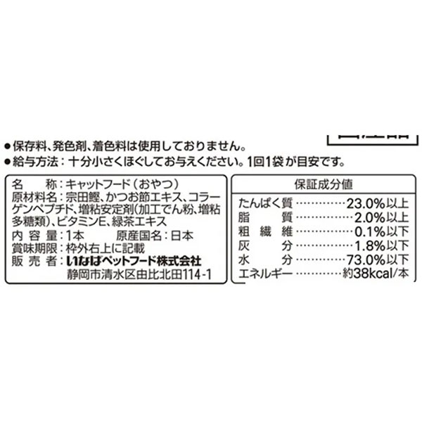 宗田鰹、かつお節エキス、コラーゲンペプチド、増粘剤(加工でん粉)、増粘多糖類、ビタミンE、緑茶エキス