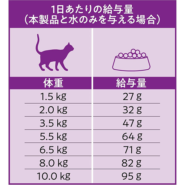 猫の種類・性別・運動量・環境などによって、必要な食事量は変動しますので、必要に応じて調整してください。新鮮な水をいつでも飲めるようにしてください。