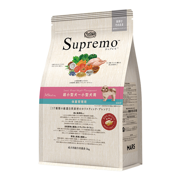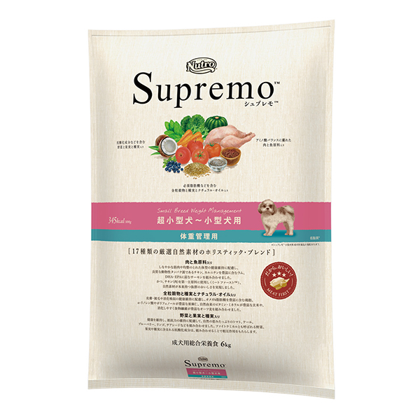 シュプレモ™ 超小型犬~小型犬用 体重管理用は、太りやすく体重が気になる超小型犬~小型犬のために脂質を抑え、さらに食事量を減らしても必須栄養素がしっかり取れるように栄養設計しつつ、チキン(肉)を原材料として一番多く使用することで、自然素材本来のおいしさを存分に味わうことができるフードです。健康で元気な体、美しい皮膚・被毛、消化吸収の健康維持に配慮し、栄養素を豊富に含む高品質な自然素材を厳選し、最適な栄養バランスでブレンドしています。また、顎・口が小さいなどの超小型犬~小型犬の特徴に配慮しています。