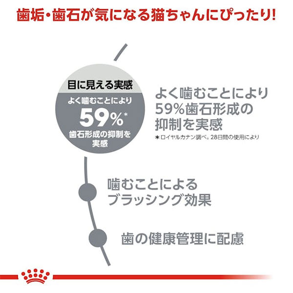 59%*の歯石形成をよく嚙むことで28日以内に抑制 ロイヤルカナン <デンタル ケア>を給与して、愛猫がよく噛むことにより、28日以内に59%*の歯石形成を抑制しました。 *ロイヤルカナン調べ - デンタル ケアではない製品と比較