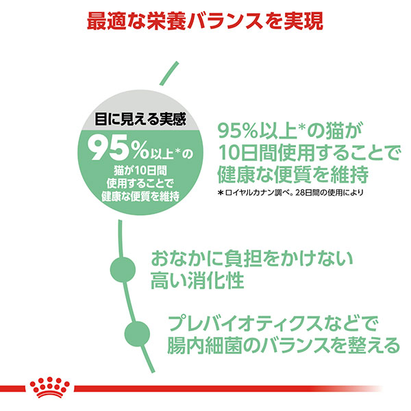<ダイジェスティブ ケア>のドライを10日間使用することで、95%以上*の猫が健康な便質の維持を実感しました。