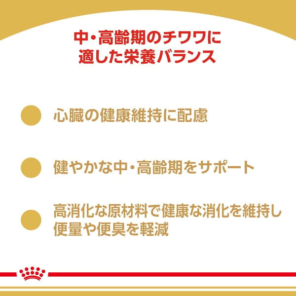 中・高齢期のチワワのために特別に設計され、ふやけやすく、しっかりと噛めるような最適な大きさ、形、食感のキブル(粒)です。