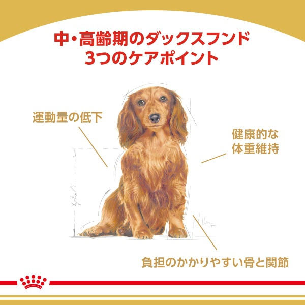 短い四肢と椎骨を持つダックスフンドは背骨に負担がかかりやすい傾向があります。<ダックスフンド 中・高齢期用>は健康な骨と関節を維持するためにカルシウムとリンをバランスよく配合し、また、EPA・DHAを配合しています。