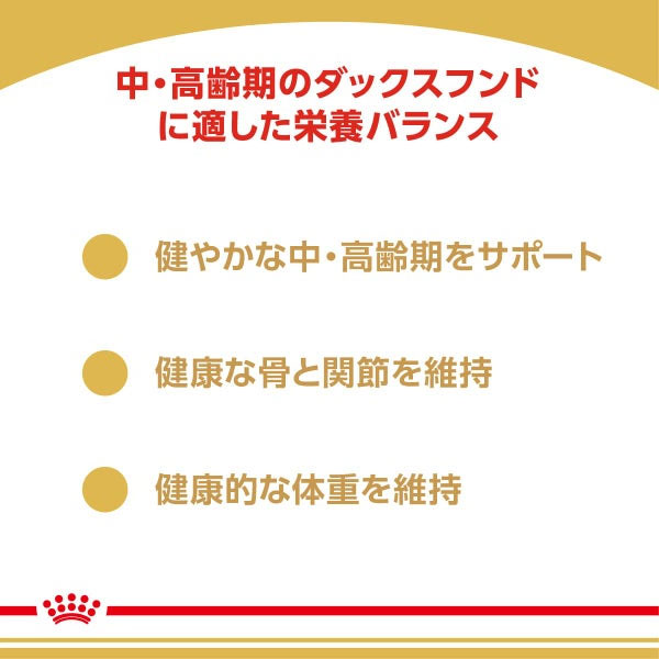中・高齢期のダックスフンドがしっかりと噛めるように最適な大きさ、形、食感にキブル(粒)を特別に設計しています。また、ふやけやすくすることで中・高齢期のダックスフンドの食欲を刺激します。