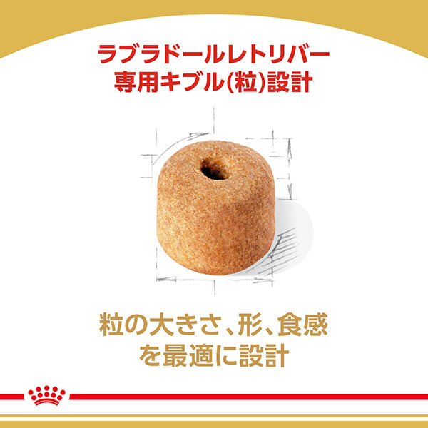 食事をあまり噛まずに飲み込みがちなラブラドールレトリバーでも、しっかり噛むように工夫されています。ラブラドールレトリバーのために特別に開発されたチューブ状のキブル(粒)が食べる速度を緩め、食べ過ぎを抑えます。