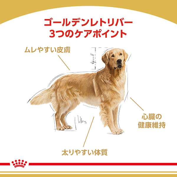 金色に輝く美しい被毛のゴールデンレトリバーは、被毛が密で皮膚がムレやすい犬種で、皮膚と被毛の健康維持に配慮が必要です。EPA・DHAなどの栄養素を配合し、適切なカロリー含有量に調整するなど、ロイヤルカナン独自の犬種ごとに最適な栄養バランスで愛犬の健康をサポートします。