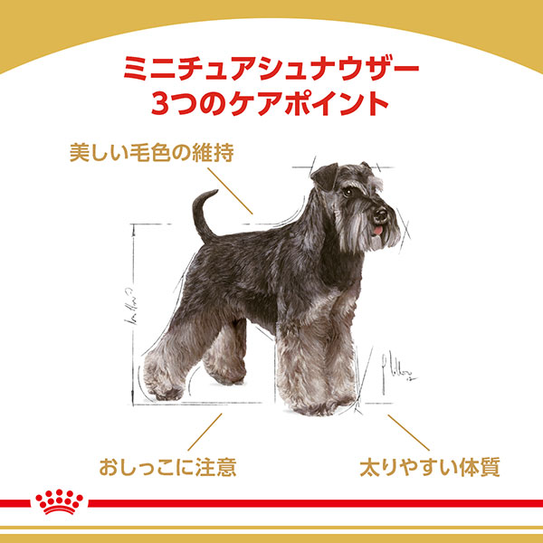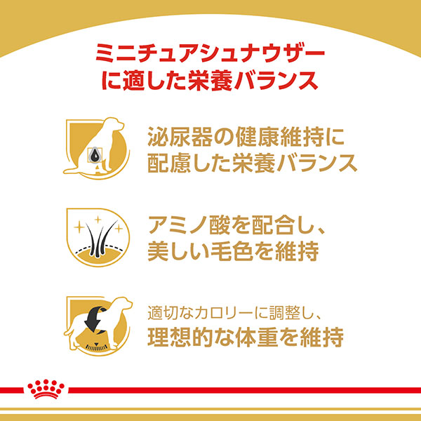 ミニチュア シュナウザーは泌尿器の健康維持のために特別な配慮が必要です。<ミニチュア シュナウザー 成犬~高齢犬用>は、泌尿器の健康を維持するため、飲水量を増やし、十分な尿量を維持するための栄養素がバランスよく配合されています。