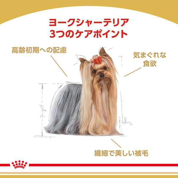 ヨークシャーテリアは、「シルキーコート」と呼ばれる美しい被毛を持つ犬種で、常に伸び続けるオーバーコート(上毛)の健康を維持するためには、特別な配慮が必要です。タンパク質の含有量を調整し、オメガ3&6系不飽和脂肪酸を配合するなど、ロイヤルカナン独自の犬種ごとに最適な栄養バランスで愛犬の健康をサポートします。
