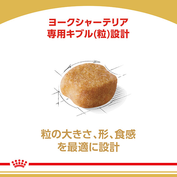 ヨークシャーテリアのあごでも簡単に捉えられて、しっかりと噛めるように設計された、最適な大きさ、形、食感のキブル(粒)です。しっかり噛むことで、歯石の形成を抑えます。
