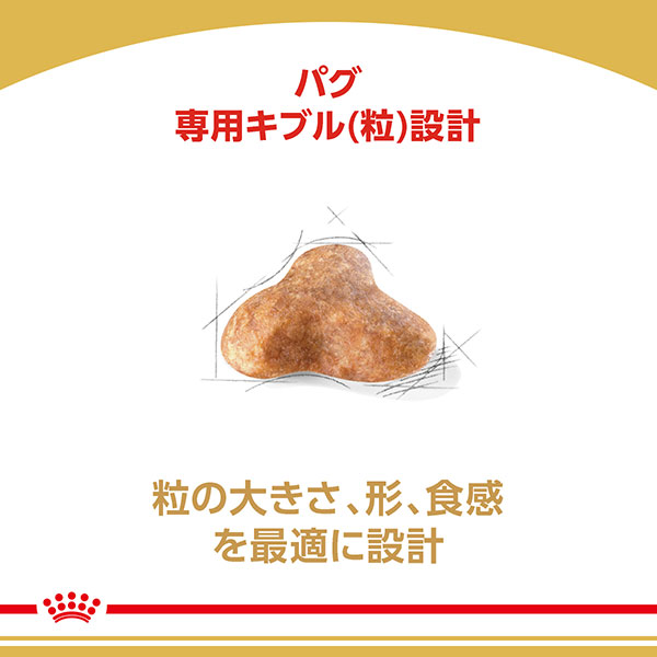 パグのあごでも簡単に捉えられて、しっかりと噛めるように設計された、最適な大きさ、形、食感のキブル(粒)です。