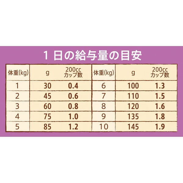 本品は、AAFCO(米国飼料検査官協会)規定の分析試験により、成犬の健康維持に適したバランスの良い総合栄養食であることが証明されています。