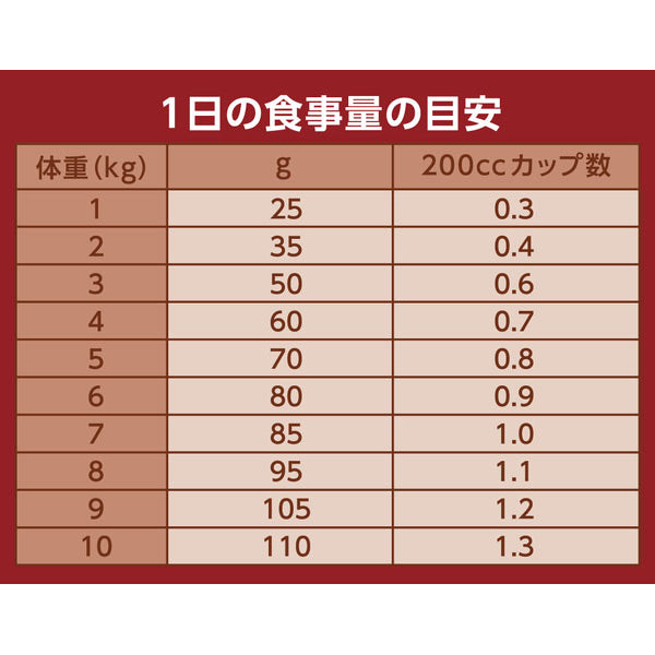 チキン(肉)、チキンミール、エンドウタンパク、エンドウマメ、鶏脂*、タピオカ、ポテトタンパク、ビートパルプ、フィッシュミール、サーモンミール、アルファルファミール、 タンパク加水分解物、亜麻仁、ユッカ抽出物、ビタミン類(A、B1、B2、B6、B12、C、D3、E、コリン、ナイアシン、パントテン酸、ビオチン、葉酸)、ミネラル類(カリウム、クロライド、セレン、ナトリウム、マンガン、ヨウ素、亜鉛、鉄、銅)、アミノ酸類(タウリン、メチオニン)、酸化防止剤(ミックストコフェロール、ローズマリー抽出物、クエン酸)* ミックストコフェロールで保存
