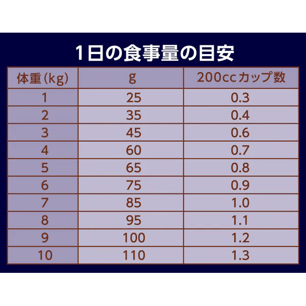 チキン(肉)、チキンミール、エンドウタンパク、ポテトでん粉、鶏脂*1*2、エンドウマメ、乾燥ポテト、フィッシュミール*3、ビートパルプ*4、アルファルファミール、ポテトタンパク、タンパク加水分解物、大豆油*1、ユッカ抽出物、ビタミン類(A、B1、B2、B6、B12、C、D3、E、コリン、ナイアシン、パントテン酸、ビオチン、葉酸)、ミネラル類(カリウム、クロライド、セレン、ナトリウム、マンガン、ヨウ素、亜鉛、鉄、銅)、アミノ酸類(タウリン、メチオニン)、酸化防止剤(ミックストコフェロール、ローズマリー抽出物、クエン酸)