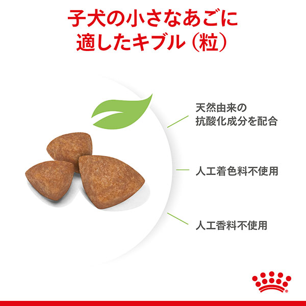 体重4kg未満の超小型犬の小さな顎に合わせてキブル(粒)の大きさを調整。 さらに独自の製法で嗜好性を上げることにより食欲にムラがある超小型犬の食欲を刺激。