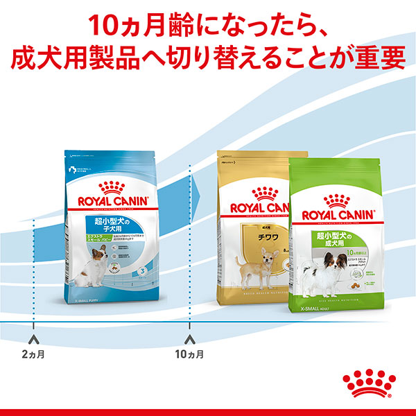 ロイヤルカナンが考える超小型犬は、成犬時の体重が4kgまでの犬です。超小型犬は生後、約10ヵ月齢で成犬になり、8歳から中高齢期、12歳からは高齢期が始まるといったライフステージをたどり、中型犬、大型犬と比べると寿命が長い傾向があります。各ライフステージで変化する栄養素の必要量や栄養バランスに配慮し、超小型犬の特徴をしっかりと考えた栄養学的なサポートが必要です。
