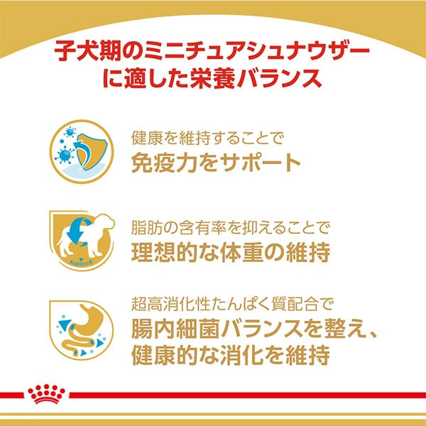 成長期は犬の一生のなかで、極めて重要な期間です。日々新しい発見や出会いを積み重ねるとともに、身体が大きく成長していきます。子犬の免疫機能は、この重要な期間に少しずつ発達していきます。<ミニチュアシュナウザー子犬用>は、ビタミンEを含む、独自に配合された抗酸化成分が健康を維持することで、子犬本来の抵抗力を維持します。