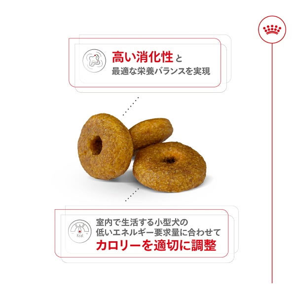 室内で生活する小型犬のエネルギー要求量に合わせたカロリー調整により、理想的な体重の維持をサポートします。