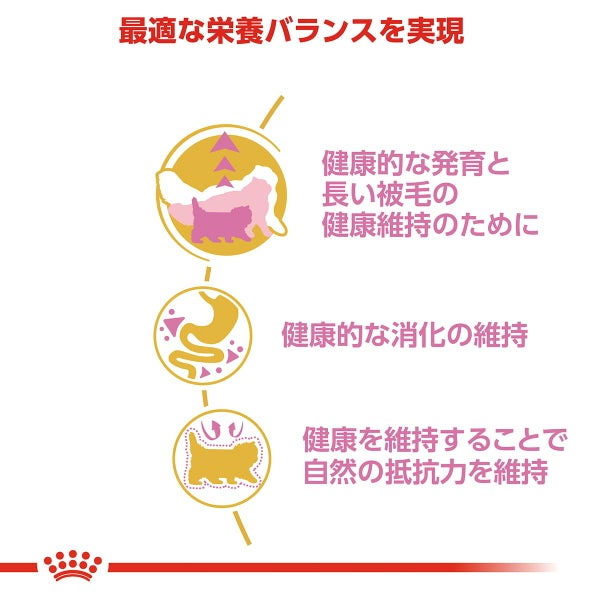 ペルシャ・チンチラ・ヒマラヤンは豪華な長い被毛と、密なアンダーコート(下毛)が特徴の猫種です。また、グルーミング時に多くの毛を飲み込む傾向があるので、毛玉の排出にも配慮が必要です。オメガ3・6系不飽和脂肪酸を配合し、サイリウムを含む複数の食物繊維を配合するなど、ロイヤルカナン独自の猫種ごとに最適な栄養バランスで愛猫の健康をサポートします。