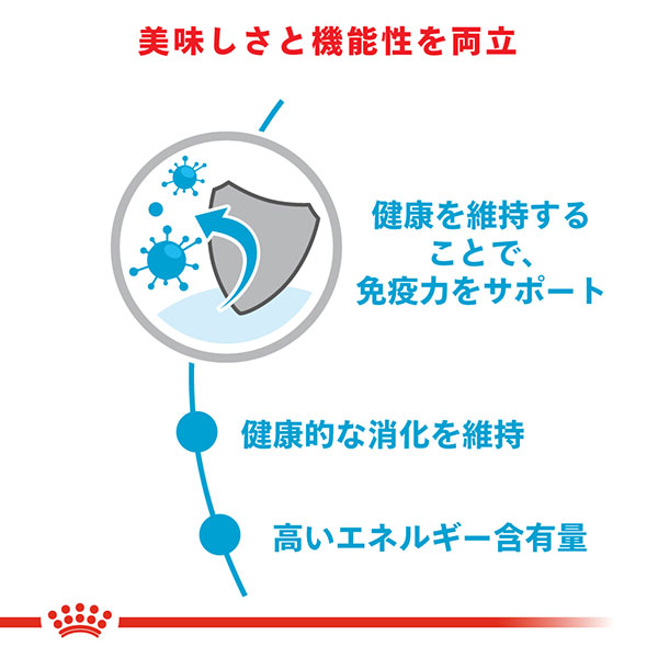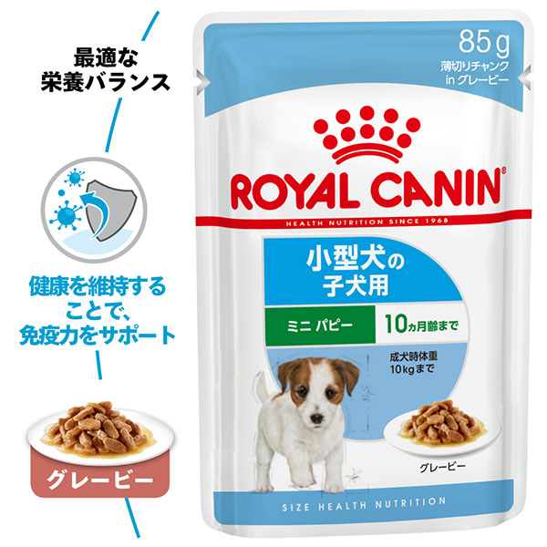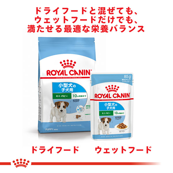 ロイヤルカナンのドライフードと混ぜて与えていただいた場合でも最適な栄養バランスを提供できるように開発された、小型犬専用のウェットフードです。高い嗜好性を実現し、食いムラの多い小型犬の食欲を刺激します。また、小型犬特有の栄養要求にも配慮。離乳期から高齢期まで、それぞれの成長段階に応じて必要な栄養バランスで、小型犬の健康をサポートします。