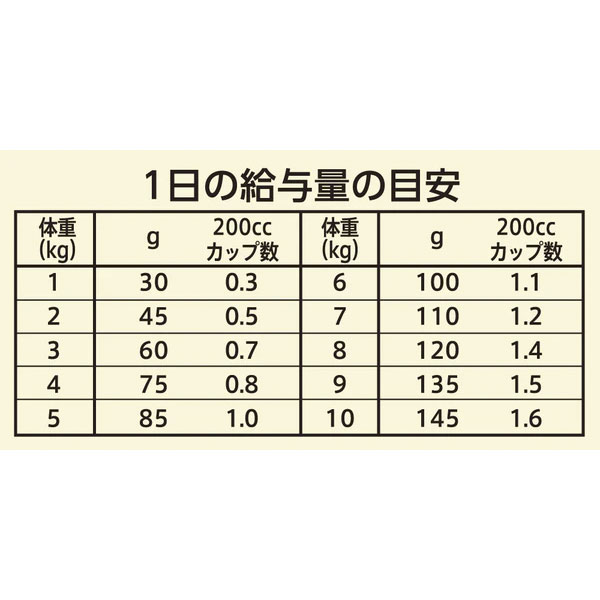 チキン(肉)、チキンミール、エンドウマメ、乾燥ポテト、鶏脂*1*2、タピオカ、ビートパルプ、乾燥チキン、エンドウタンパク、タンパク加水分解物、亜麻仁*3、アルファルファミール、ビタミン類(A、B1、B2、B6、B12、C、D3、E、コリン、ナイアシン、パントテン酸、ビオチン、葉酸)、ミネラル類(カリウム、クロライド、セレン、ナトリウム、マンガン、ヨウ素、亜鉛、鉄、銅)、アミノ酸類(メチオニン)、酸化防止剤(ミックストコフェロール、ローズマリー抽出物、クエン酸)