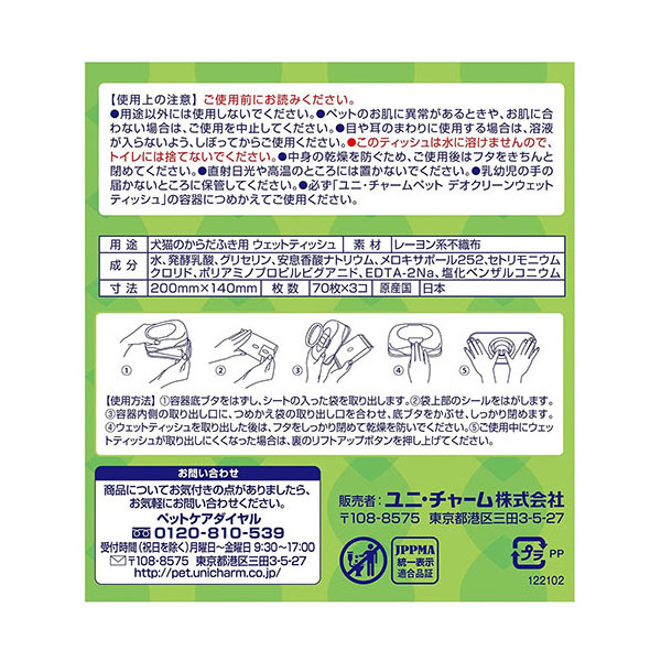 ユニ・チャームペットケア デオクリーン 純水99%ウェットティッシュつめかえ用 70枚3個パック