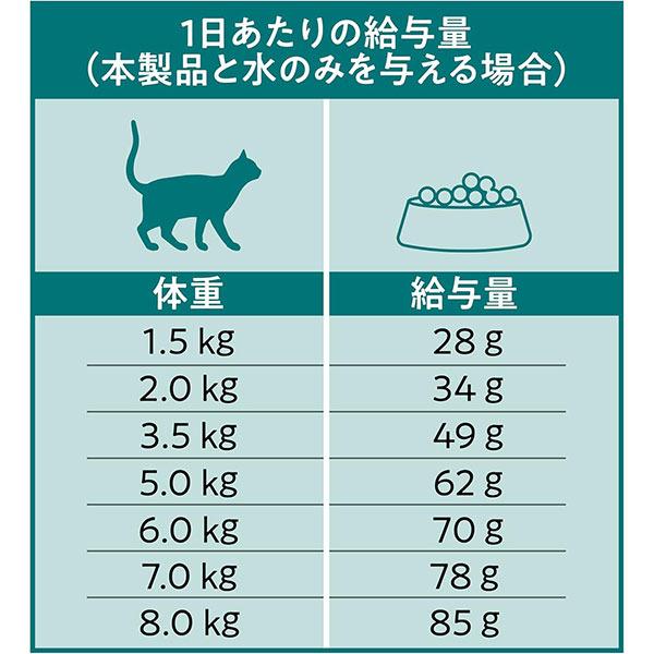 猫の種類・性別・運動量・環境などによって、必要な食事量は変動しますので、必要に応じて調整してください。新鮮な水をいつでも飲めるようにしてください。