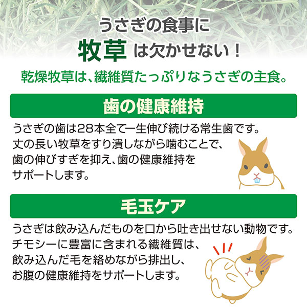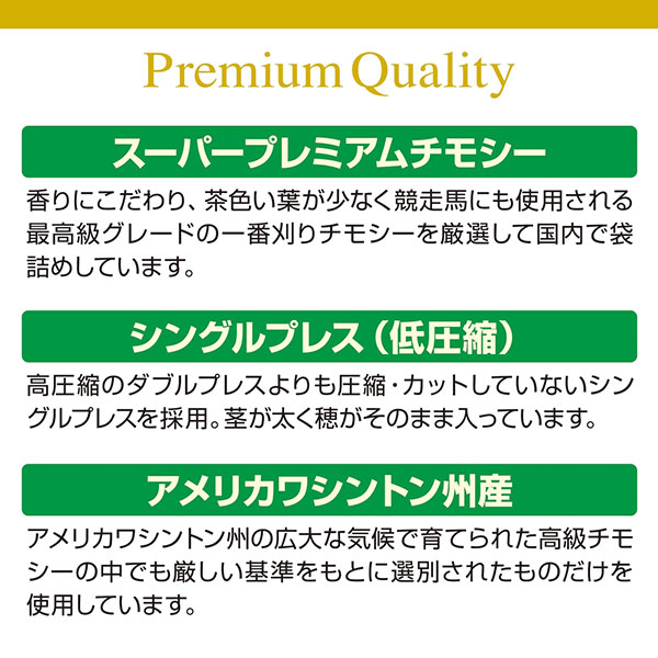 ●香りにこだわり、茶色い葉が少なく競走馬にも使用される最高級グレードの一番刈りチモシーを厳選して国内で袋詰めしています。●高圧縮のダブルプレスよりも圧縮・カットしていないシングルプレスを採用。●アメリカワシントン州の広大な気候で育てられた高級チモシーの中でも厳しい基準をもとに選別されたものだけを使用しています。●丈の長い牧草をすり潰しながら噛むことで、歯の伸びすぎを抑え、歯の健康維持をサポートします。●チモシーに豊富に含まれる繊維質は、飲み込んだ毛を絡めながら排出し、お腹の健康維持をサポートします。●主食として毎日食べる牧草は、高繊維でカロリーが低いチモシーが最適です。