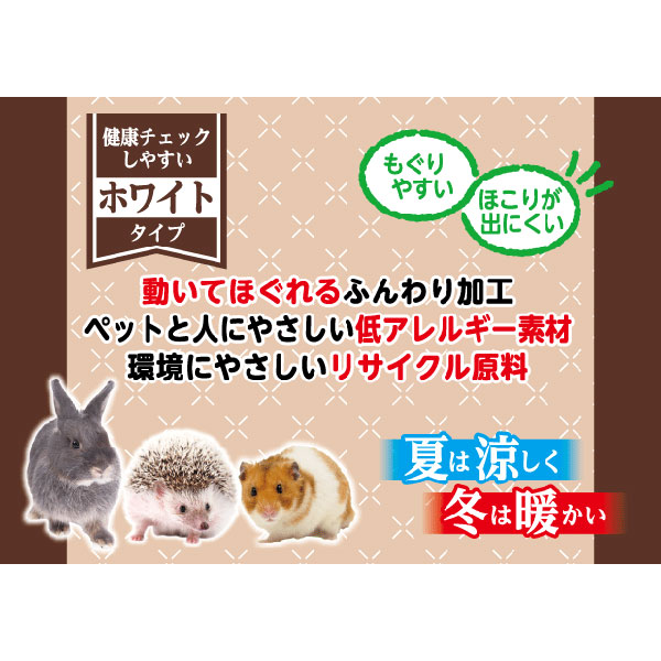 小動物の快適な生活空間を創る紙製の床材 ほぐしやすくもぐりやすい“ふんわり加工” 夏は涼しく、冬は暖かい快適空間 人にもペットにも優しい、低アレルギー素材