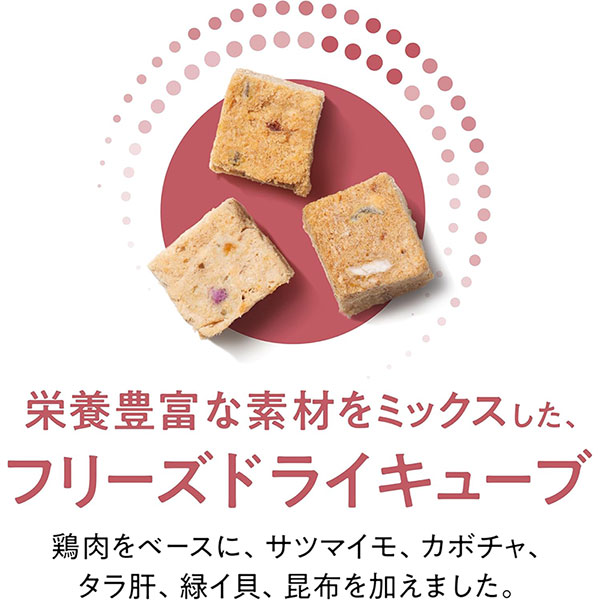 風味と栄養の両方を向上させるために、キブルにフリーズドライのチキンを追加、栄養豊富なフリーズドライをトッピングしたダブルフリーズドライ製法を使用しています。毎日風味が良く必須栄養素を満たした食事を食べてもらうことにこだわりました!