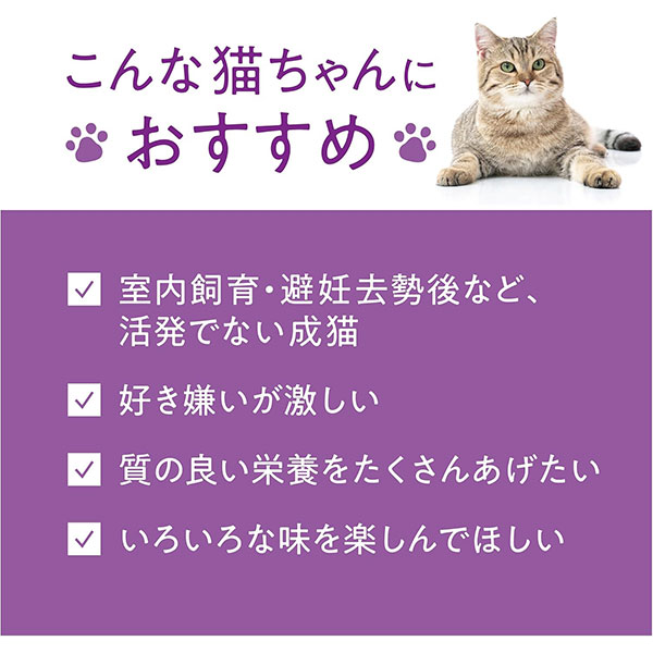 L-カルニチンが健康な代謝をサポートし、オメガ-3脂肪酸が皮膚と被毛の健康を維持します。こだわりの強い猫でも喜んでくれる原材料設計にしています。消化しやすい炭水化物の組み合わせにより、一日を通してバランスの取れたエネルギーを得ることができます。プレバイオティクスとプロバイオティクスが良い腸内環境を促進し、最適な消化をサポートします。