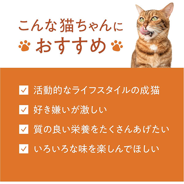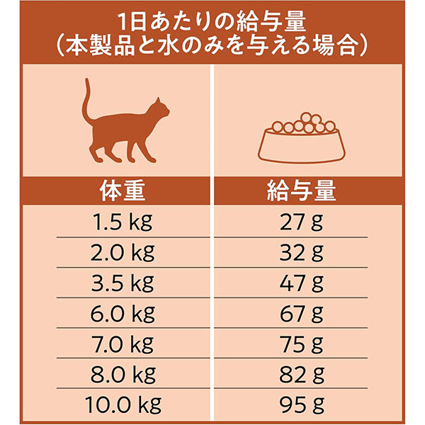 猫の種類・性別・運動量・環境などによって、必要な食事量は変動しますので、必要に応じて調整してください。新鮮な水をいつでも飲めるようにしてください。