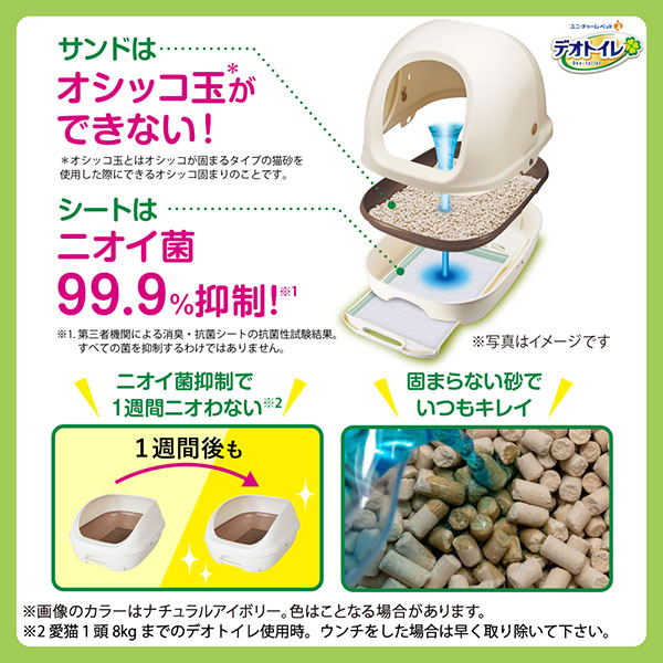 ※1 愛猫1頭(体重8kgまで)の1日の平均尿量と【消臭・抗菌シート】の保水量から使用期間の目安を算出しました。(当社調べ)飼育している愛猫の数、体重や体調、尿量、使用しているトイレの広さ、季節によって変化します。使用期間は目安として早めに交換してください。