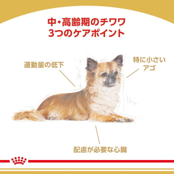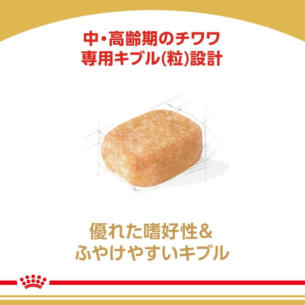 中・高齢期のチワワのために特別に設計され、ふやけやすく、しっかりと噛めるような最適な大きさ、形、食感のキブル(粒)です。