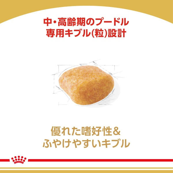 中・高齢期のプードルがしっかりと噛めるように最適な大きさ、形、食感にキブル(粒)を特別に設計しています。また、ふやけやすくすることで中・高齢期のプードルの食欲を刺激します。