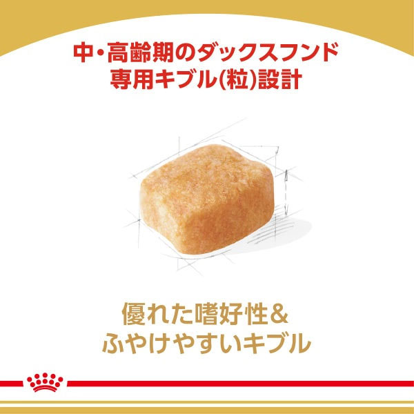 中・高齢期のダックスフンドがしっかりと噛めるように最適な大きさ、形、食感にキブル(粒)を特別に設計しています。また、ふやけやすくすることで中・高齢期のダックスフンドの食欲を刺激します。