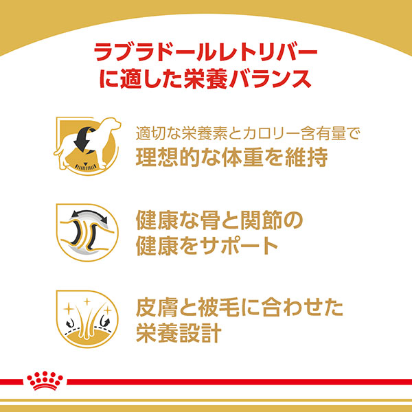 ラブラドールレトリバーは太りやすい傾向のある犬種です。<ラブラドールレトリバー 成犬~高齢犬用>は、最適なカロリー量にすることによって理想的な体重を維持します。
