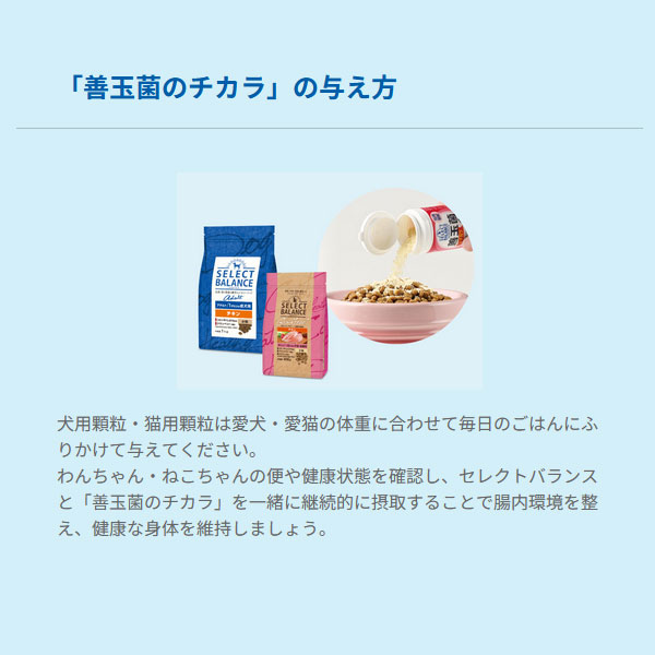 わんちゃん・ねこちゃんの便や健康状態を確認し、セレクトバランスと「善玉菌のチカラ」を一緒に継続的に摂取することで腸内環境を整え、健康な身体を維持しましょう。