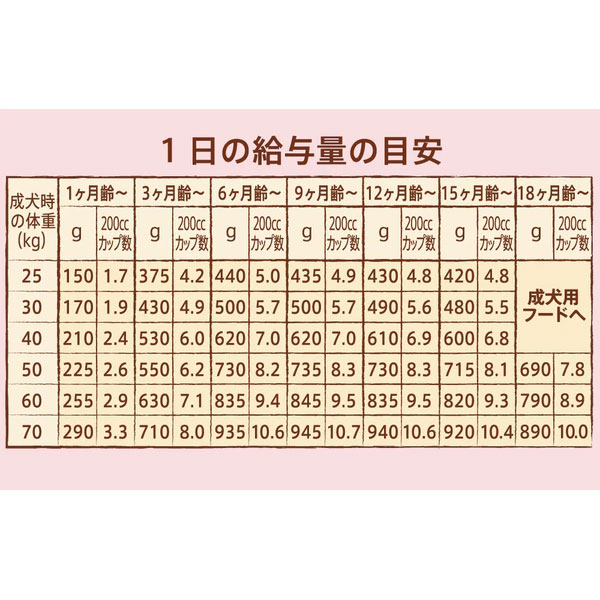 良質なタンパク質と脂質を調整し、大型犬の子犬の健康な発育のために栄養バランスに配慮しています。消化吸収の健康維持のため、良質なタンパク質や、玄米などバランスの良い食物繊維を組み合わせて使用し、大型犬の子犬の健康な骨格の発育のために必要なカルシウムとリンのバランスに配慮しています。また、子犬の健康な脳の発育と、視力の健康維持に必要なDHAを豊富に含むフィッシュオイルを使用しています。さらに、鶏脂やフィッシュオイルなどに含まれる必須脂肪酸であるオメガ3と6の適切なバランスを参考に設計し、皮膚・被毛の健康維持をサポートします。妊娠中・授乳中の母犬や、高栄養要求時の愛犬にも最適な栄養バランスです。