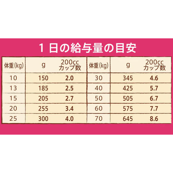 本品は、AAFCO(米国飼料検査官協会)規定の分析試験により、成犬の健康維持に適したバランスの良い総合栄養食であることが証明されています。