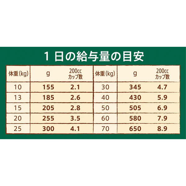 本品は、AAFCO(米国飼料検査官協会)規定の分析試験により、成犬の健康維持に適したバランスの良い総合栄養食であることが証明されています。
