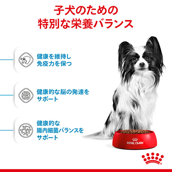 生後10ヶ月までの短い成長期に必要な高いエネルギー要求量を満たす特別な栄養設計で、超小型犬の子犬の成長をサポートします。