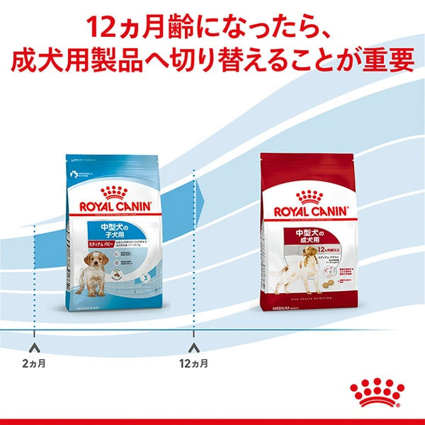 ロイヤルカナンが考える中型犬は、成犬時の体重が11kg~25kgの犬です。中型犬は、おおよそ生後12ヵ月齢で成犬になり、7歳から中高齢期、10歳からは高齢期が始まるといったライフステージをたどります。各ライフステージで変化する栄養素の必要量や栄養バランスに配慮し、中型犬の特徴をしっかりと考えた栄養学的なサポートが必要です。
