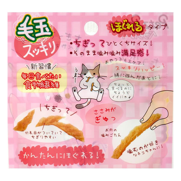 食物繊維約10%でほぐれるひとくちサイズの鶏ささみです。噛むのが好きなネコちゃんにお肉の噛みごたえをのこした毛玉ケアスナックです。