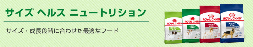 サイズ ヘルス ニュートリションは、身体サイズによる犬の特性に配慮し、それぞれのサイズの犬の栄養要求を満たす総合栄養食です。エクストラスモール、ミニ、ミディアム、マキシと4つのサイズに分け、そのなかで年齢やライフスタイル、その時々の栄養要求を満たす製品を提供しています。